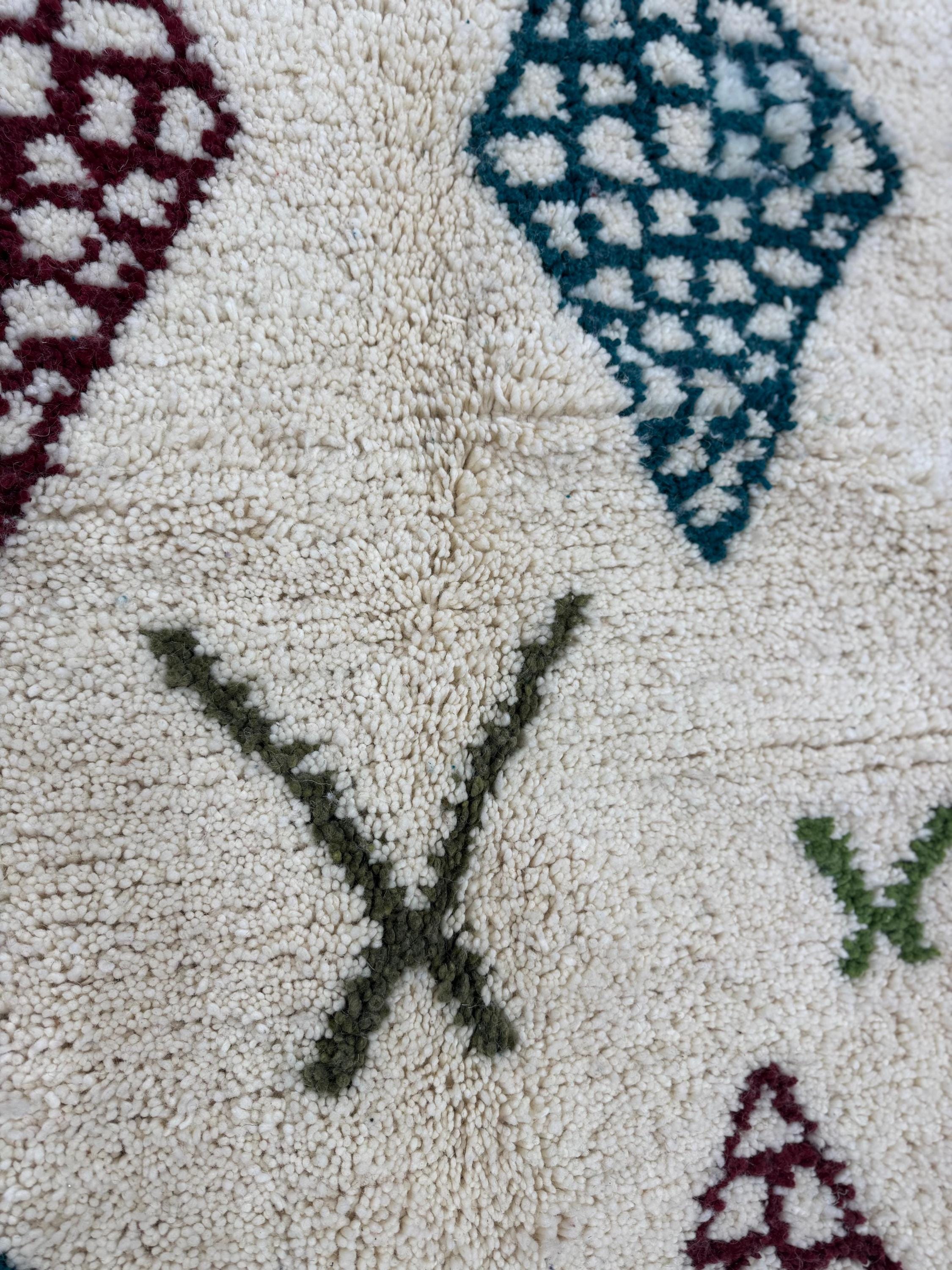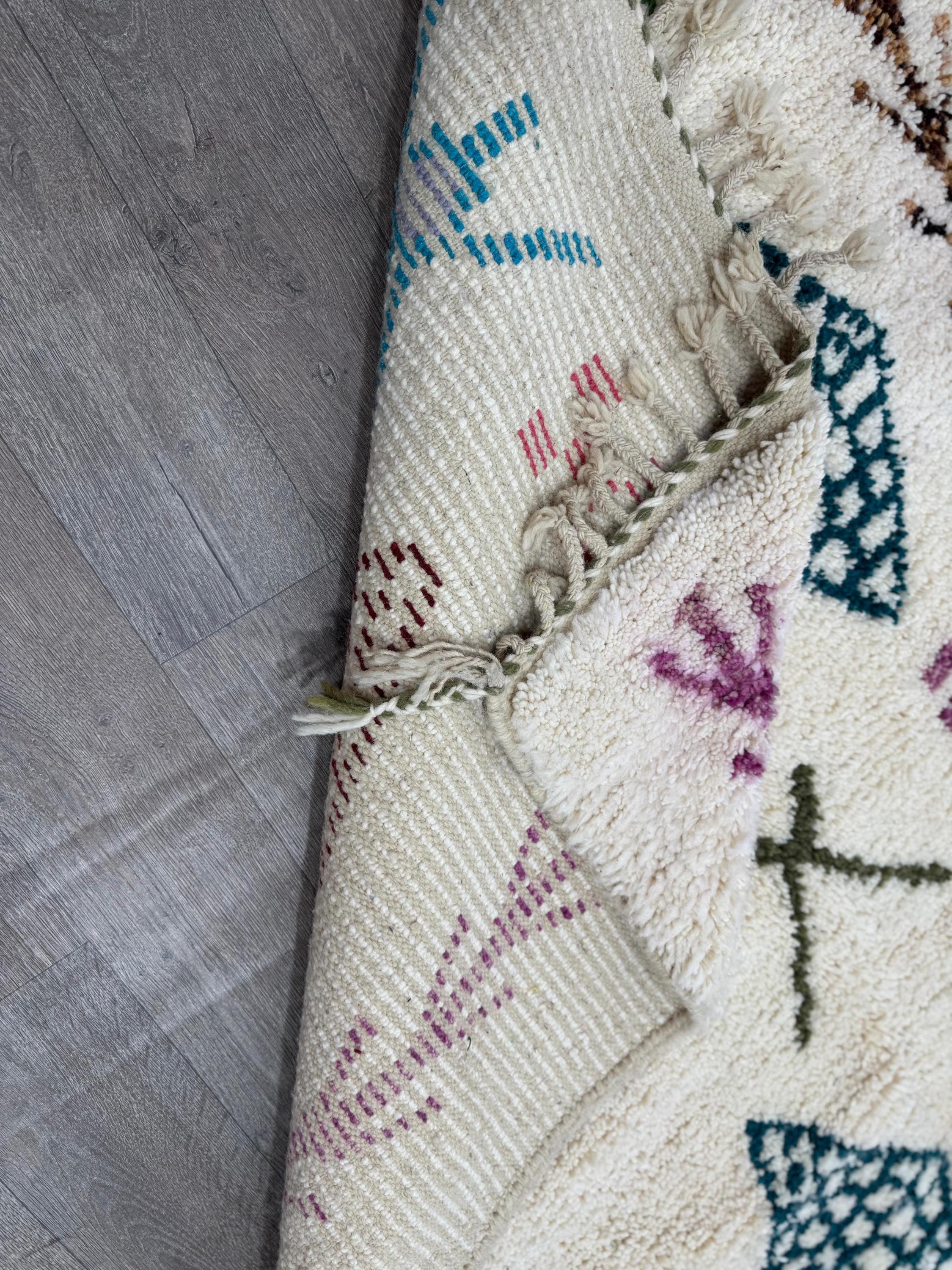This stunning Beni Ourain rug, woven in natural ivory wool with a unique and colorful letter M in the center, brings warmth, charm, and character to any interior. It pairs beautifully with Bohemian, Modern, Scandinavian, and Traditional home styles.