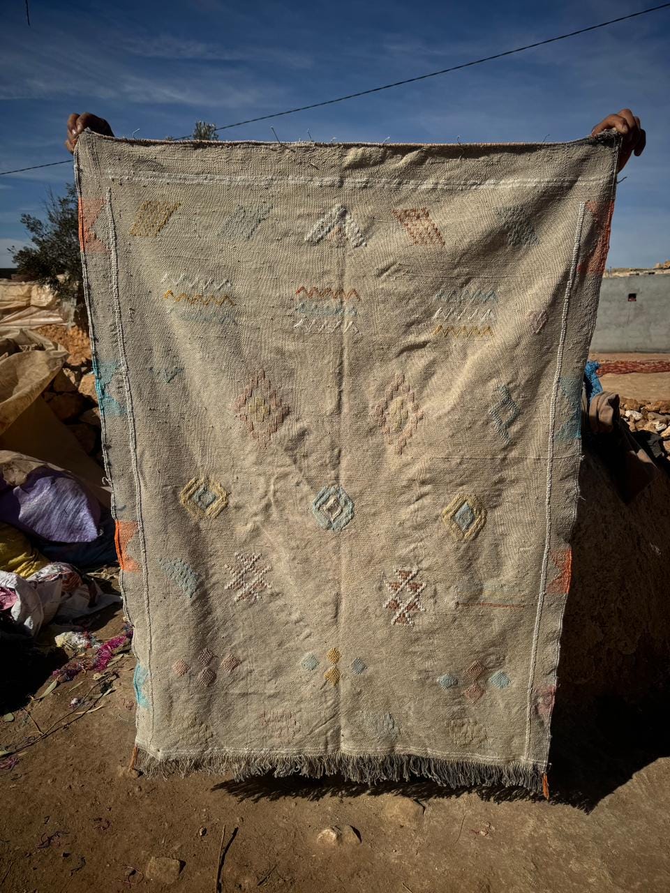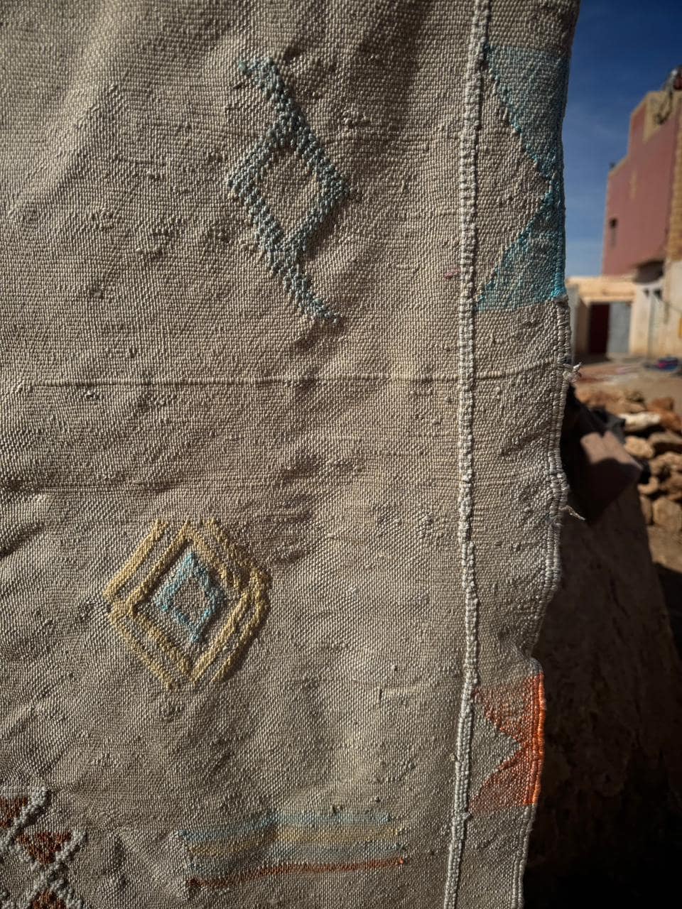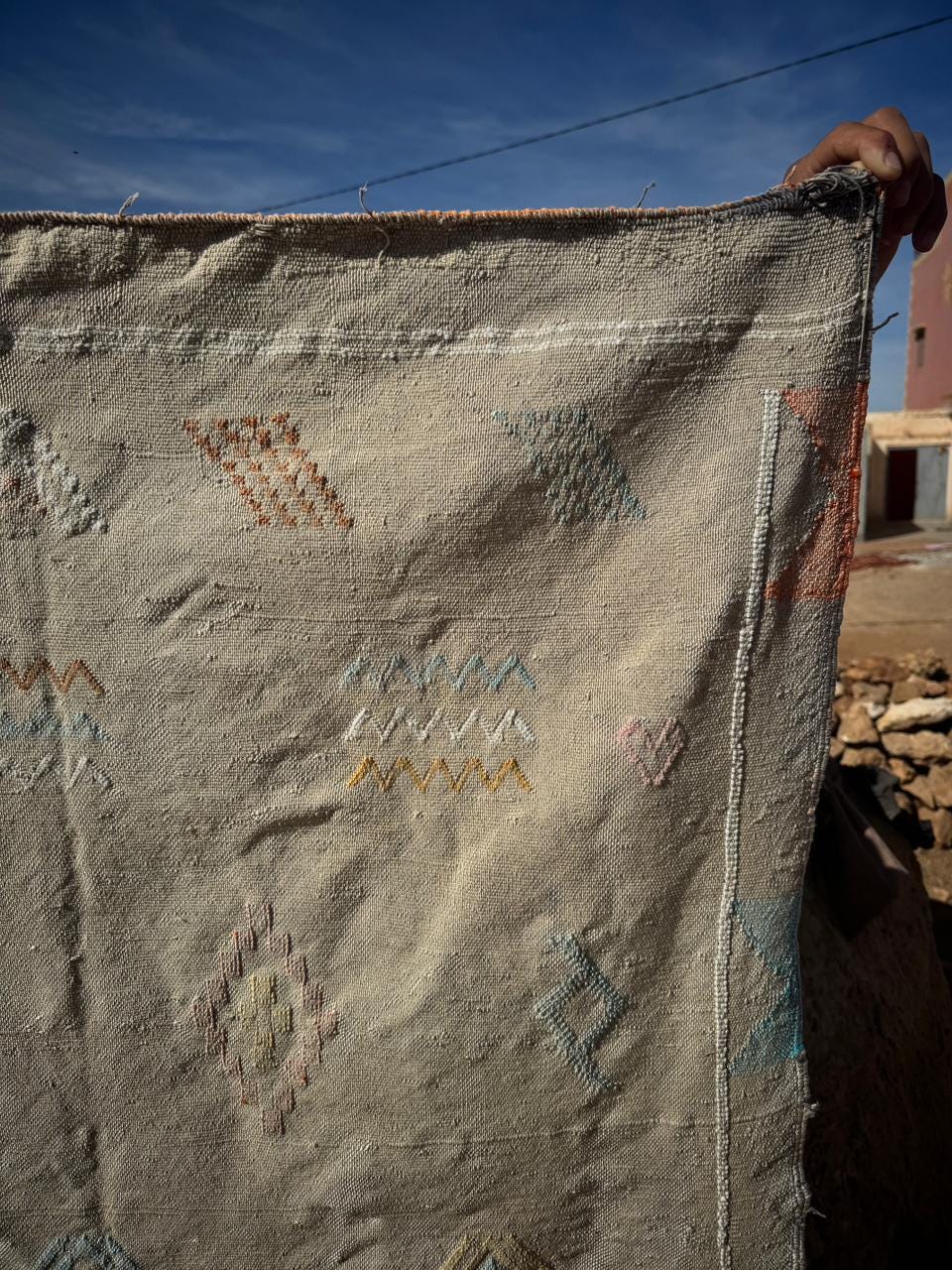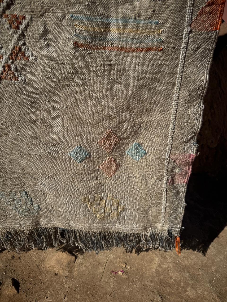 A Moroccan kilim rug handwoven from natural Sabra silk, known for its soft texture and delicate sheen. This unique piece features traditional Berber tribal patterns in warm earthy tones, reflecting the beauty of authentic Moroccan craftsmanship. It's a true masterpiece that adds a touch of elegance, culture, and timeless charm to any interior space.