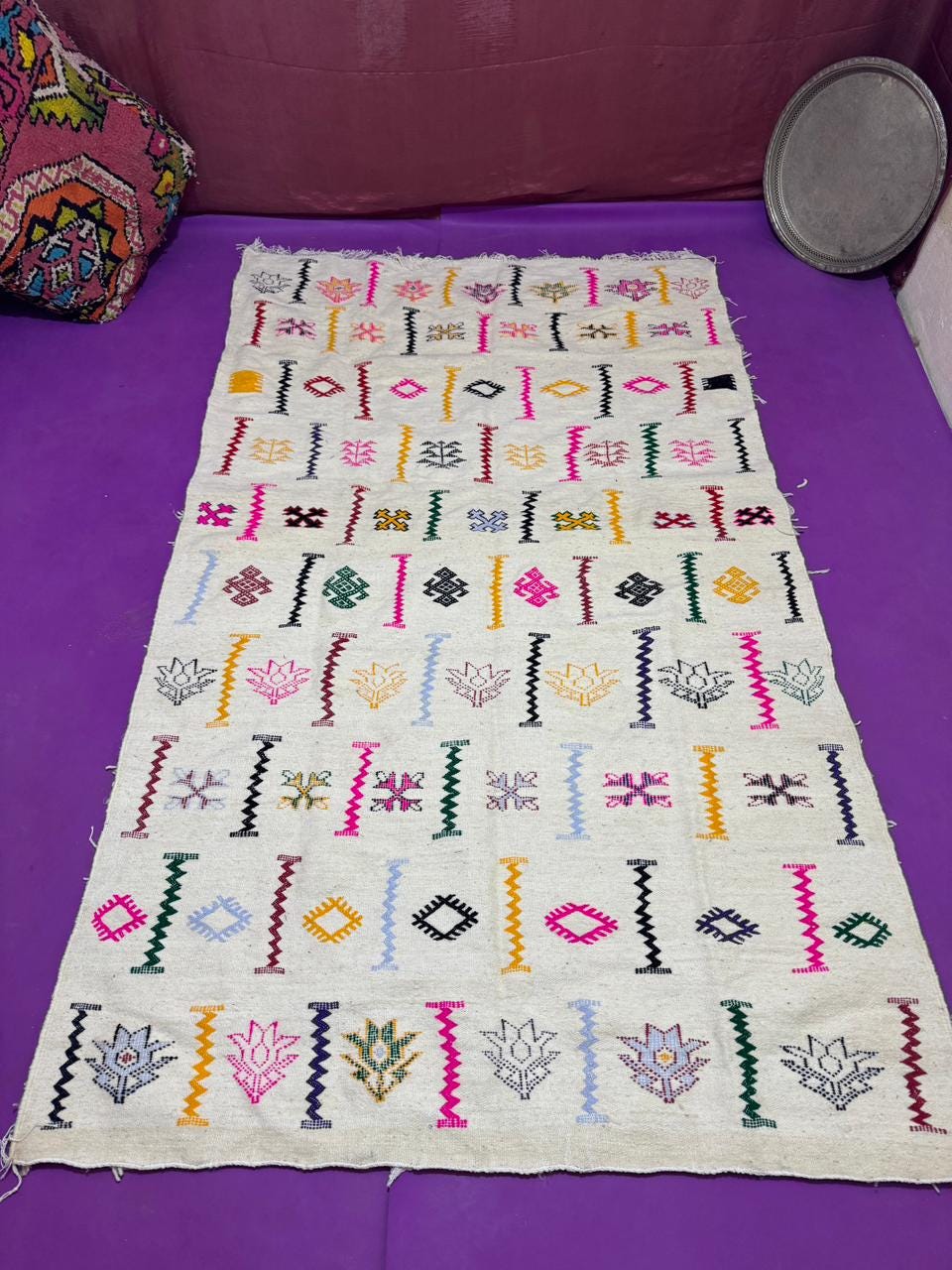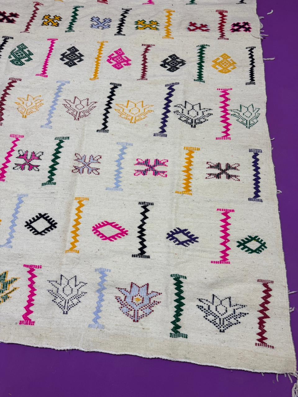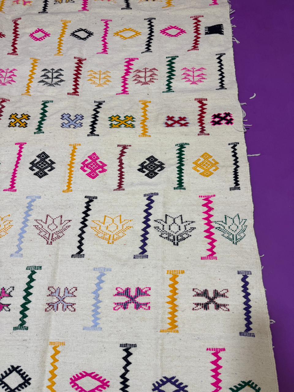 Flat-weave Amazigh kilim rug, handwoven from natural white wool and adorned with traditional Amazigh symbols embroidered in dark (deep green or black) threads. This kilim combines minimalism and heritage, making it a perfect fit for both modern and bohemian interiors. Ideal for use as a floor covering or a decorative wall hanging, it brings a calm and authentic touch to any space.
