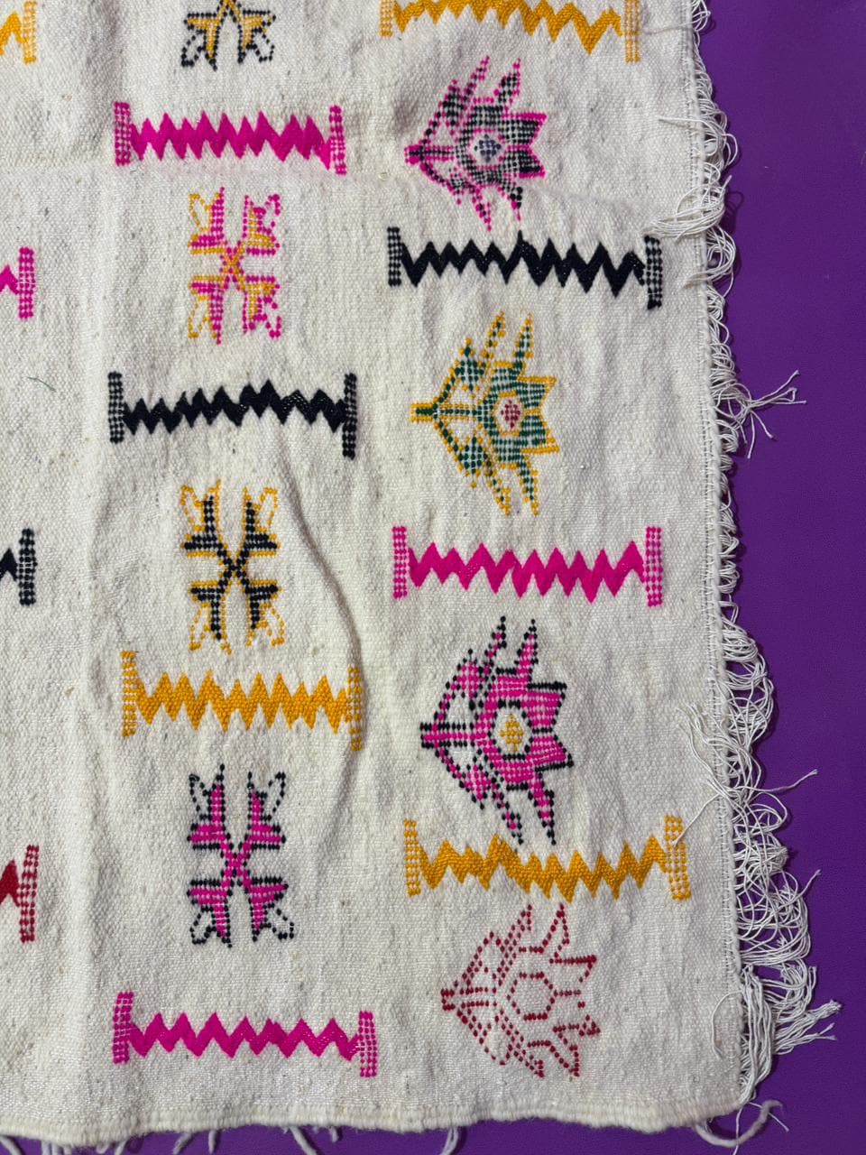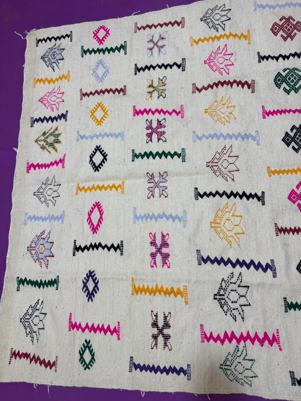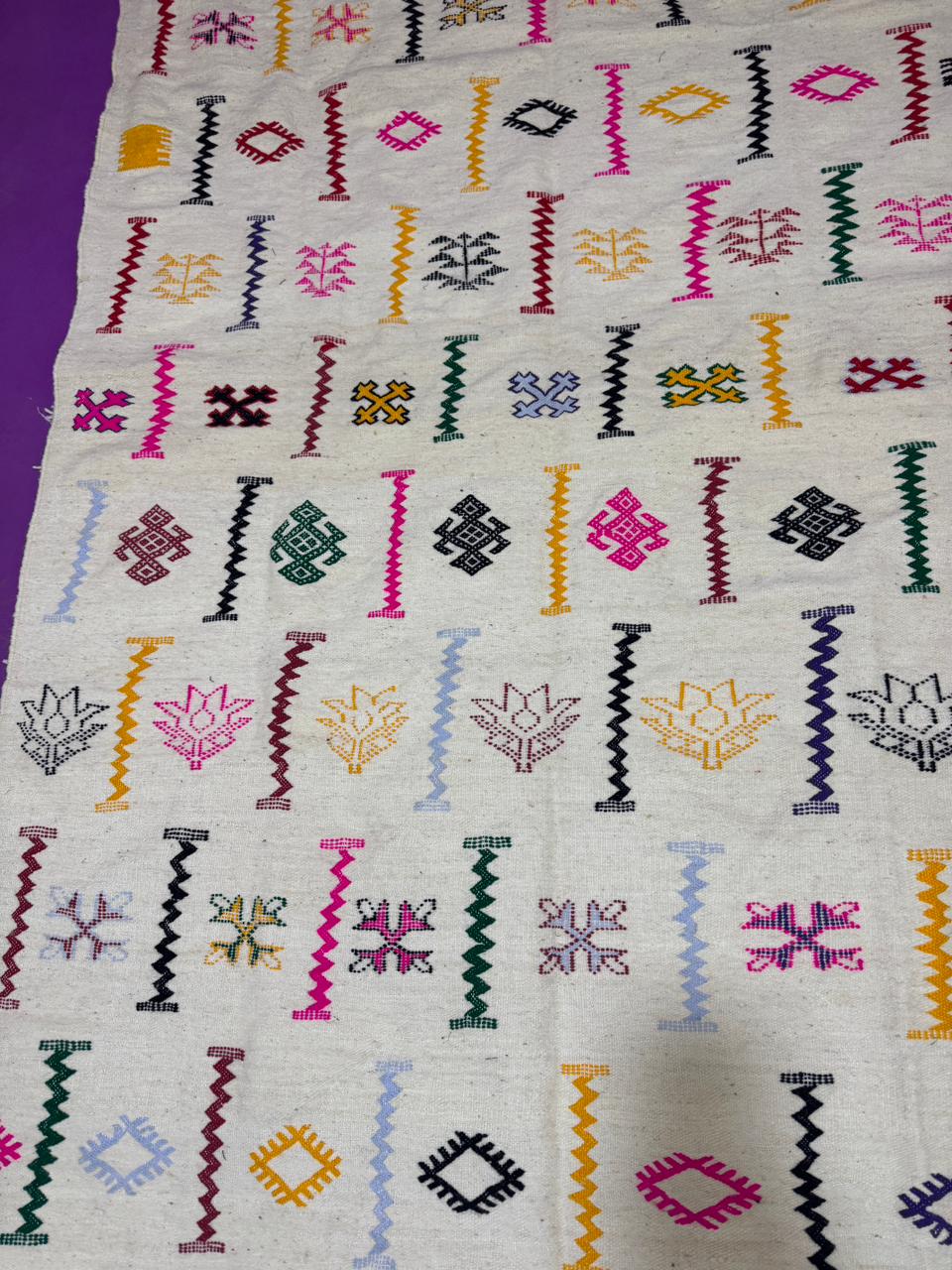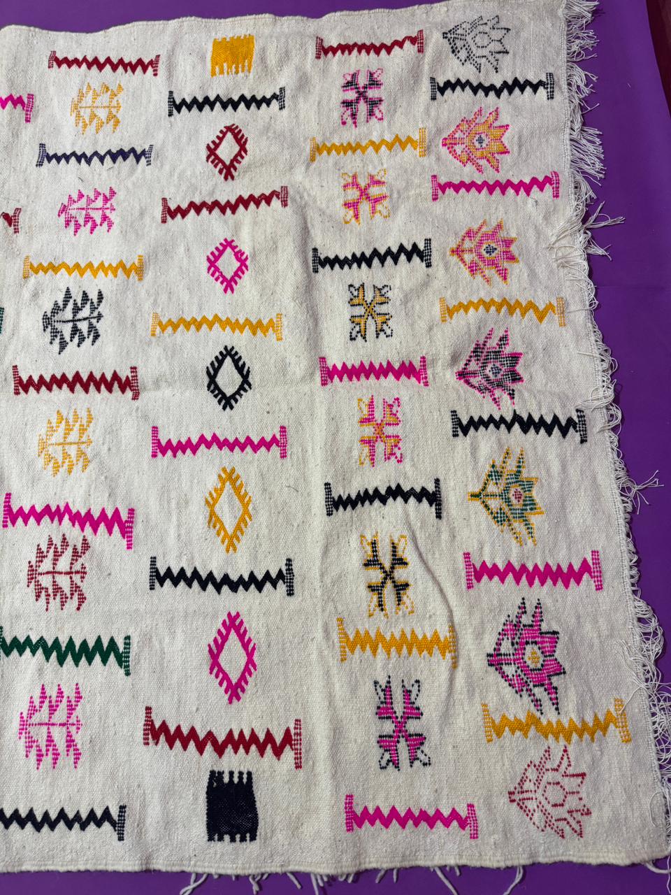 Flat-weave Amazigh kilim rug, handwoven from natural white wool and adorned with traditional Amazigh symbols embroidered in dark (deep green or black) threads. This kilim combines minimalism and heritage, making it a perfect fit for both modern and bohemian interiors. Ideal for use as a floor covering or a decorative wall hanging, it brings a calm and authentic touch to any space.