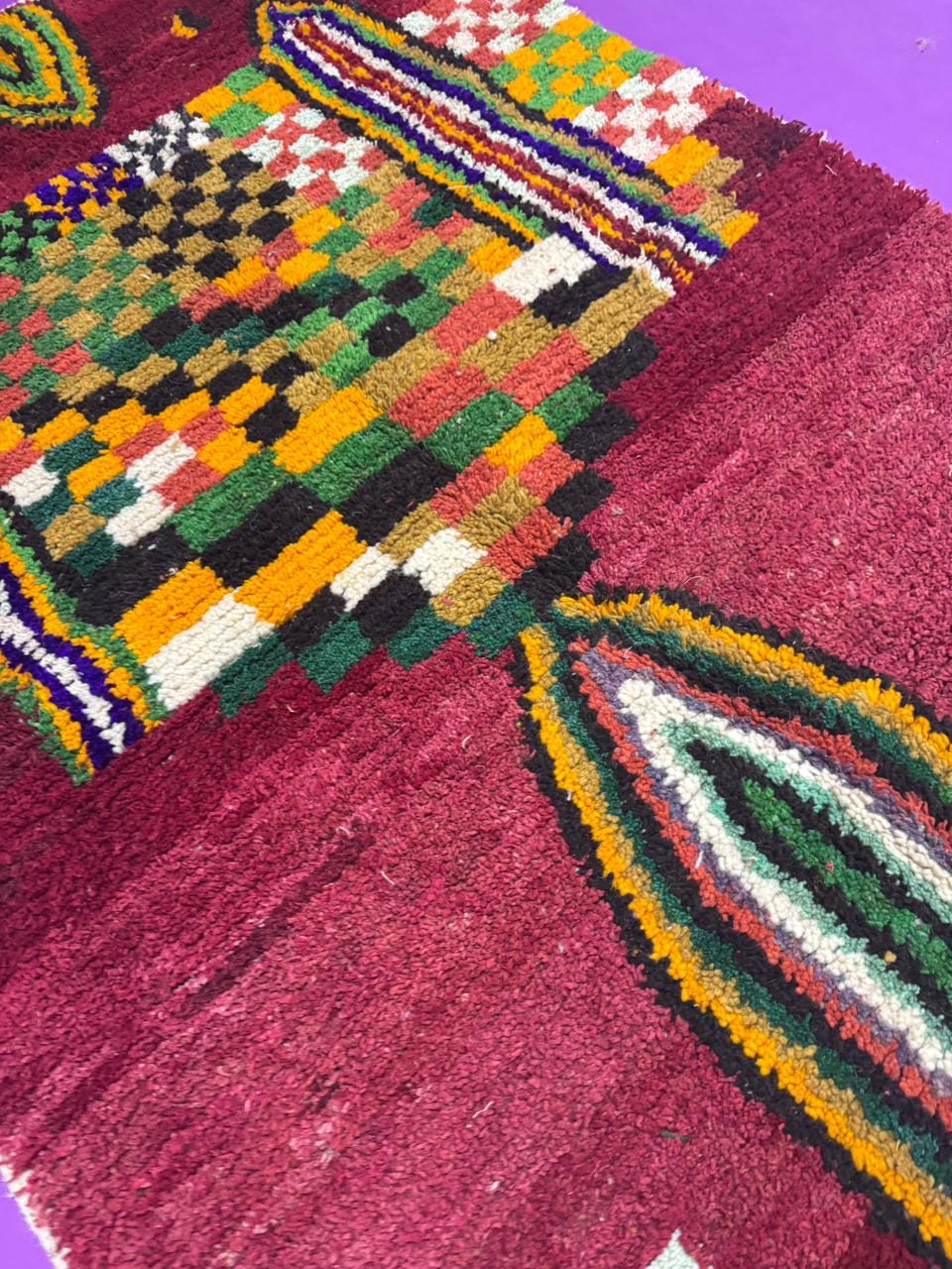 Made from recycled wool and cotton, this unique piece embodies the creativity and resilience of Moroccan artisans. The striking color palette makes it perfect for eclectic, bohemian, or modern interiors—whether placed on the floor or used as a colorful wall hanging.