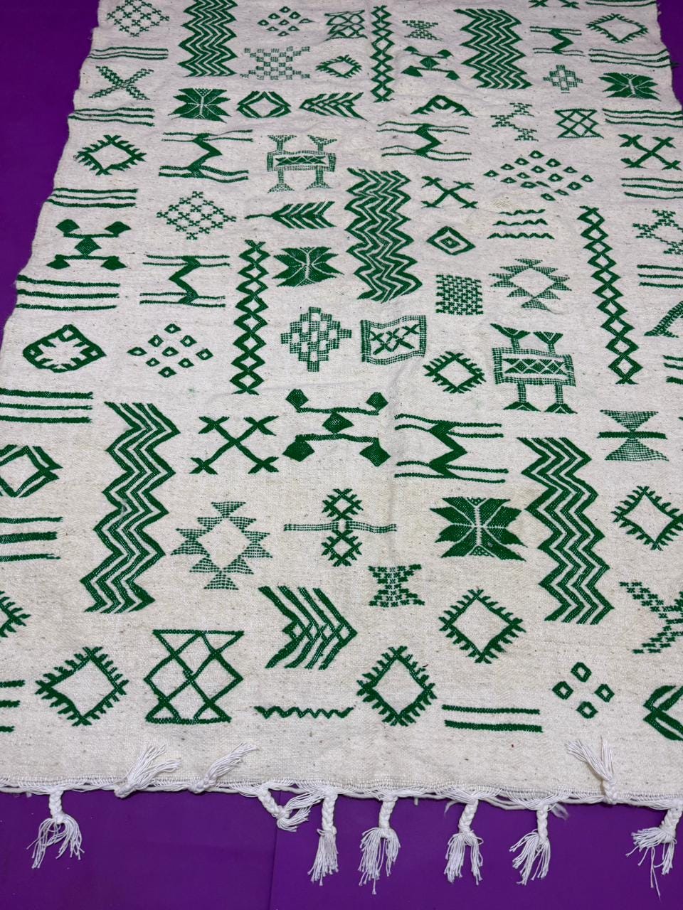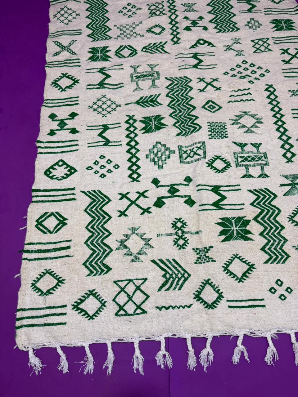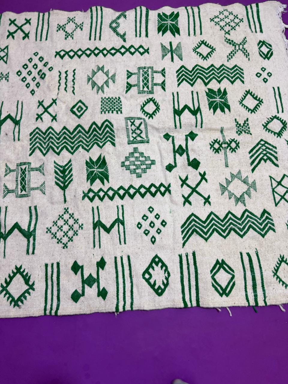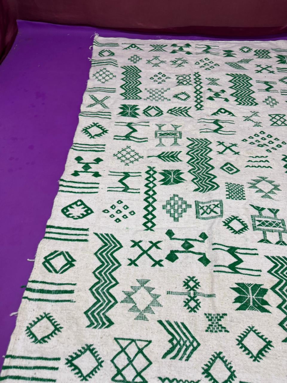 Handwoven Amazigh (Berber) kilim from Morocco, crafted with natural wool threads on a white background. It features a variety of colorful geometric Amazigh symbols in shades of red, blue, green, purple, and orange. This flat-weave rug is lightweight and versatile, perfect for use as a floor covering or a decorative wall hanging. A unique piece that embodies Amazigh identity and authentic Moroccan heritage.