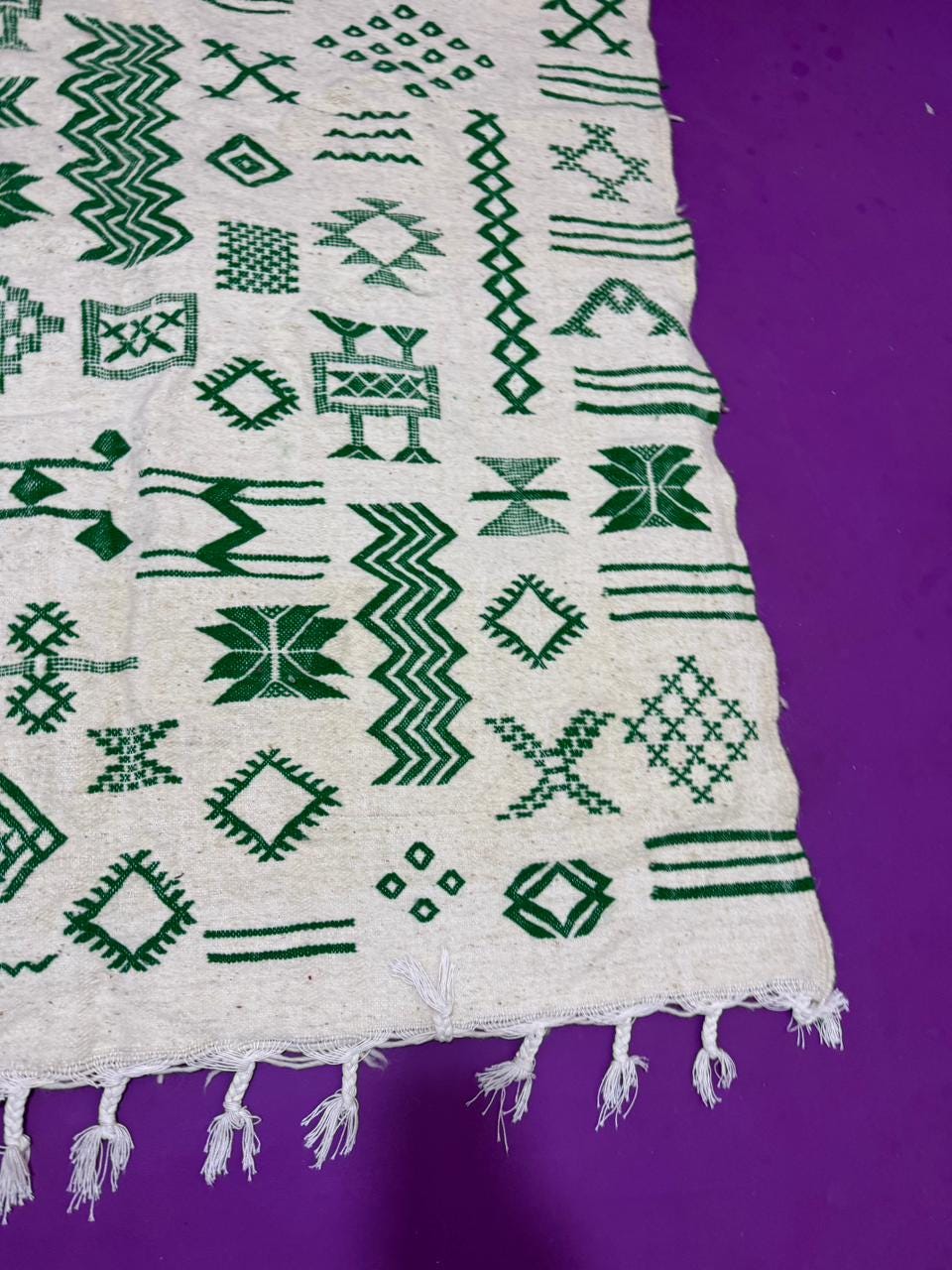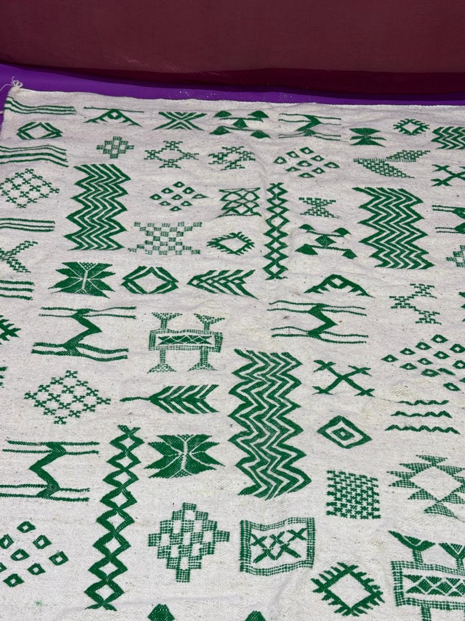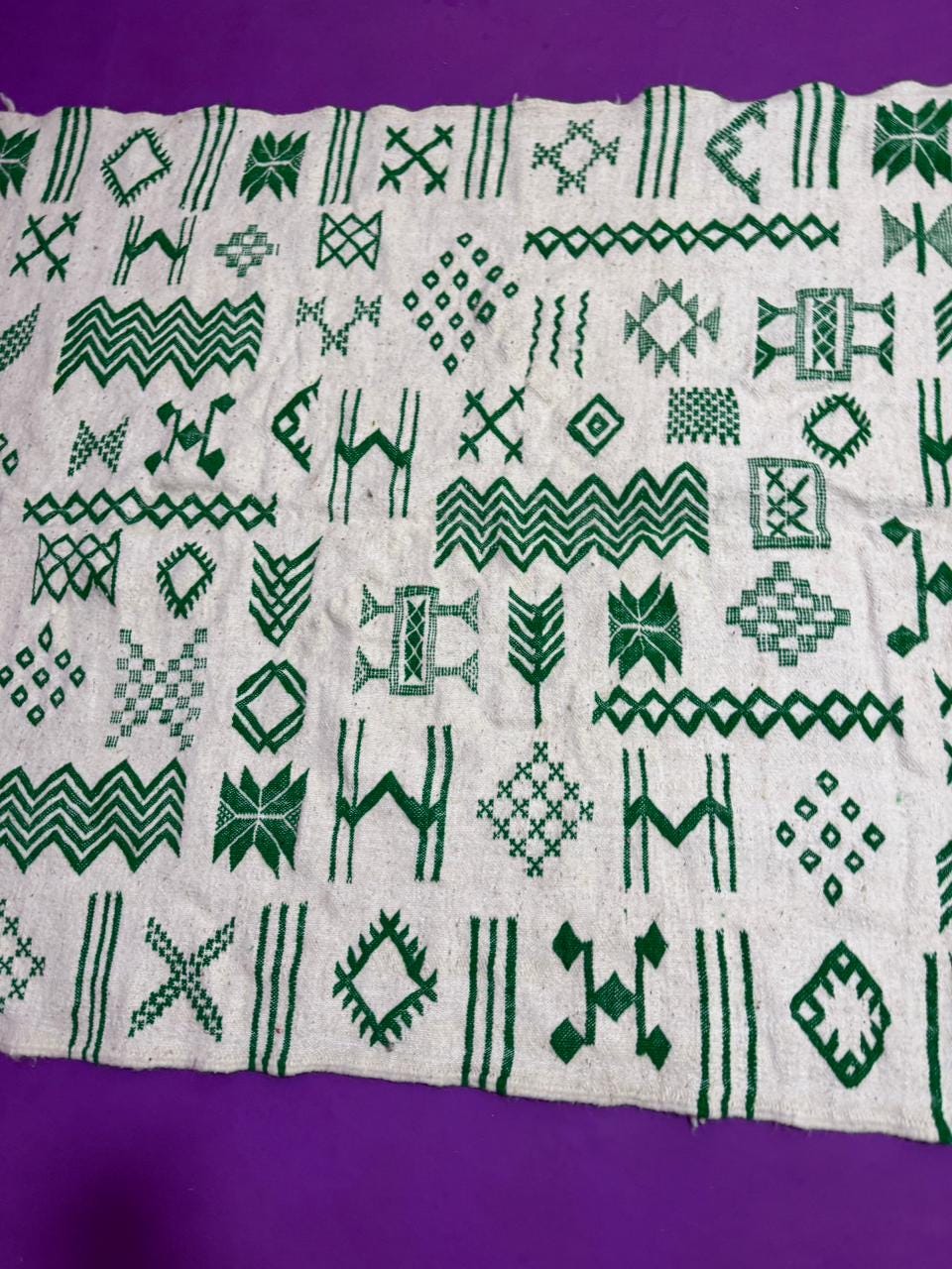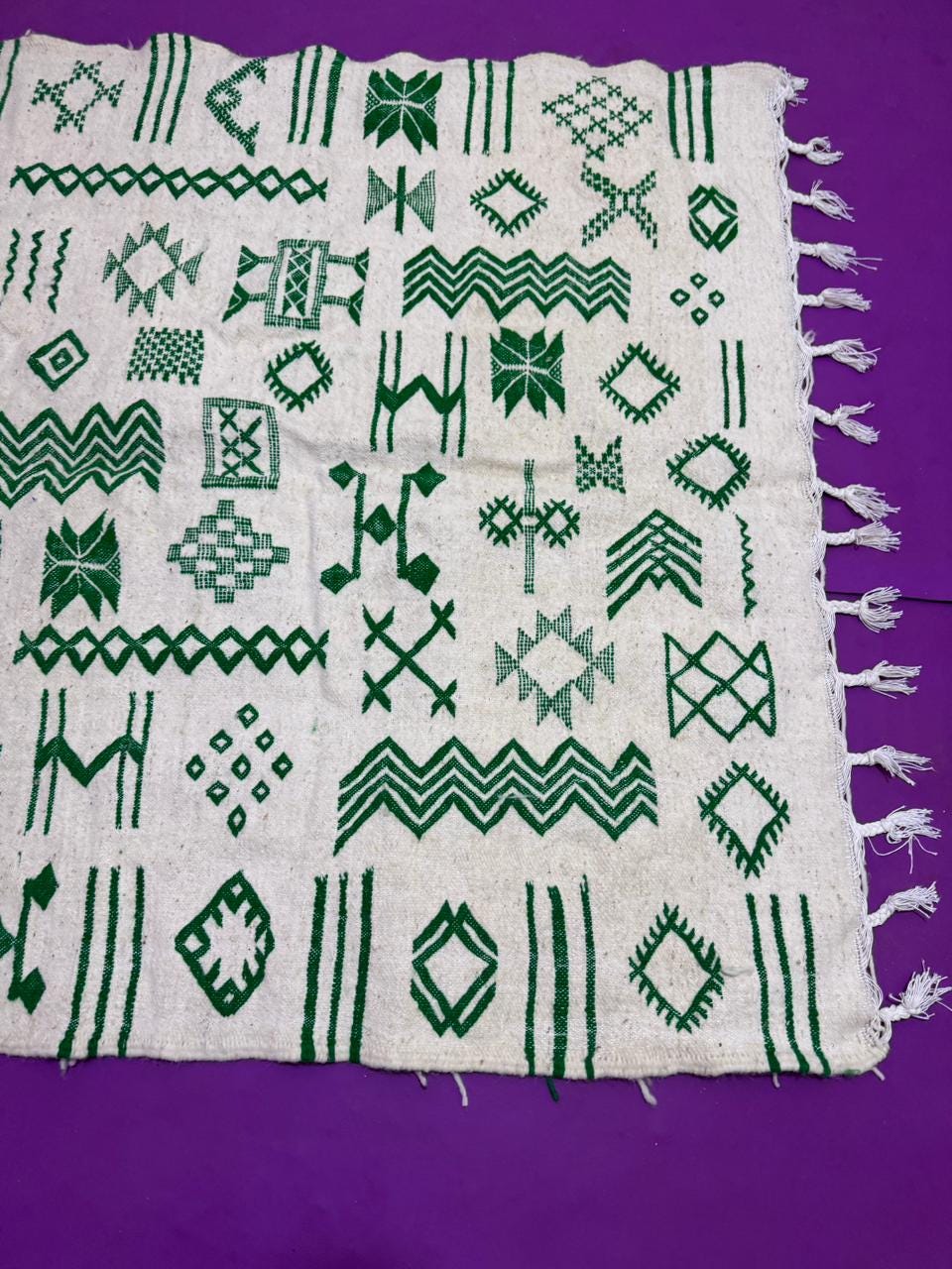 Handwoven Amazigh (Berber) kilim from Morocco, crafted with natural wool threads on a white background. It features a variety of colorful geometric Amazigh symbols in shades of red, blue, green, purple, and orange. This flat-weave rug is lightweight and versatile, perfect for use as a floor covering or a decorative wall hanging. A unique piece that embodies Amazigh identity and authentic Moroccan heritage.