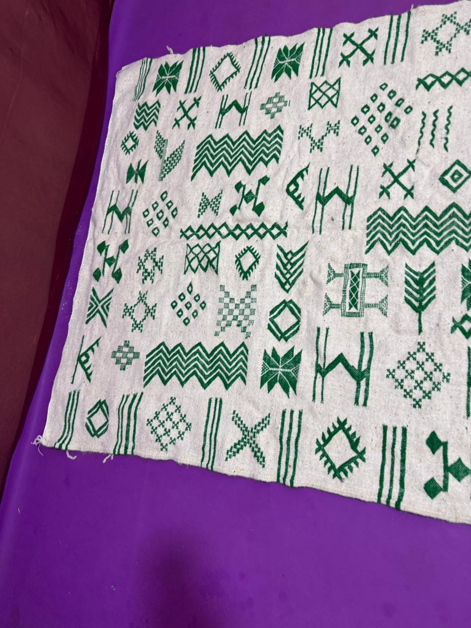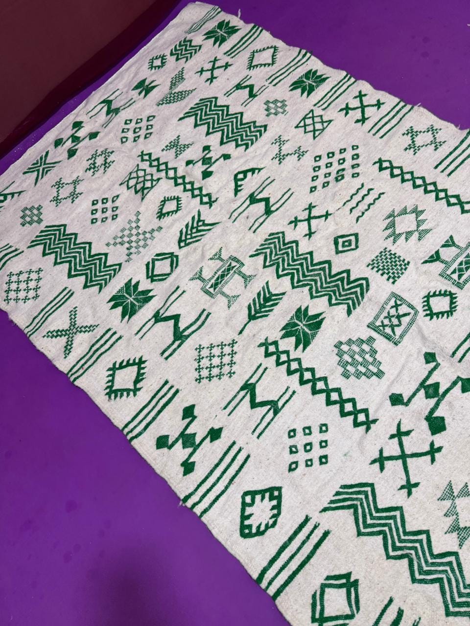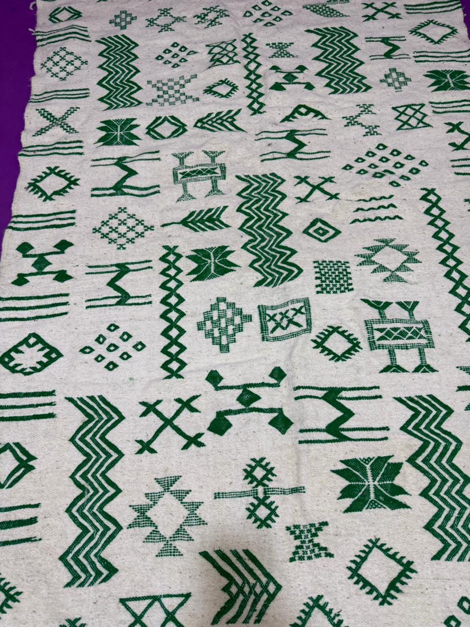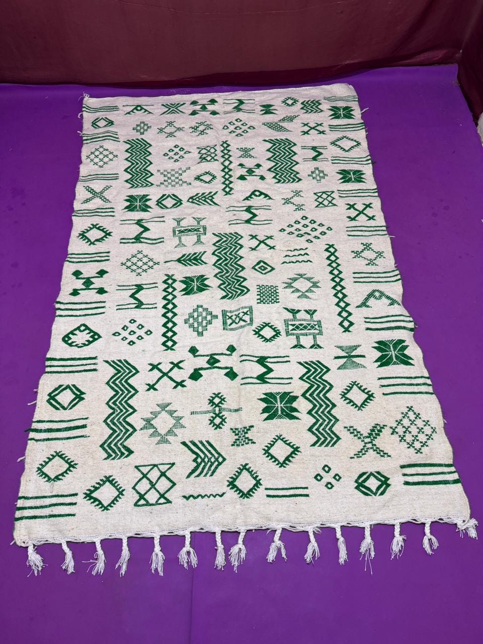Handwoven Amazigh (Berber) kilim from Morocco, crafted with natural wool threads on a white background. It features a variety of colorful geometric Amazigh symbols in shades of red, blue, green, purple, and orange. This flat-weave rug is lightweight and versatile, perfect for use as a floor covering or a decorative wall hanging. A unique piece that embodies Amazigh identity and authentic Moroccan heritage.