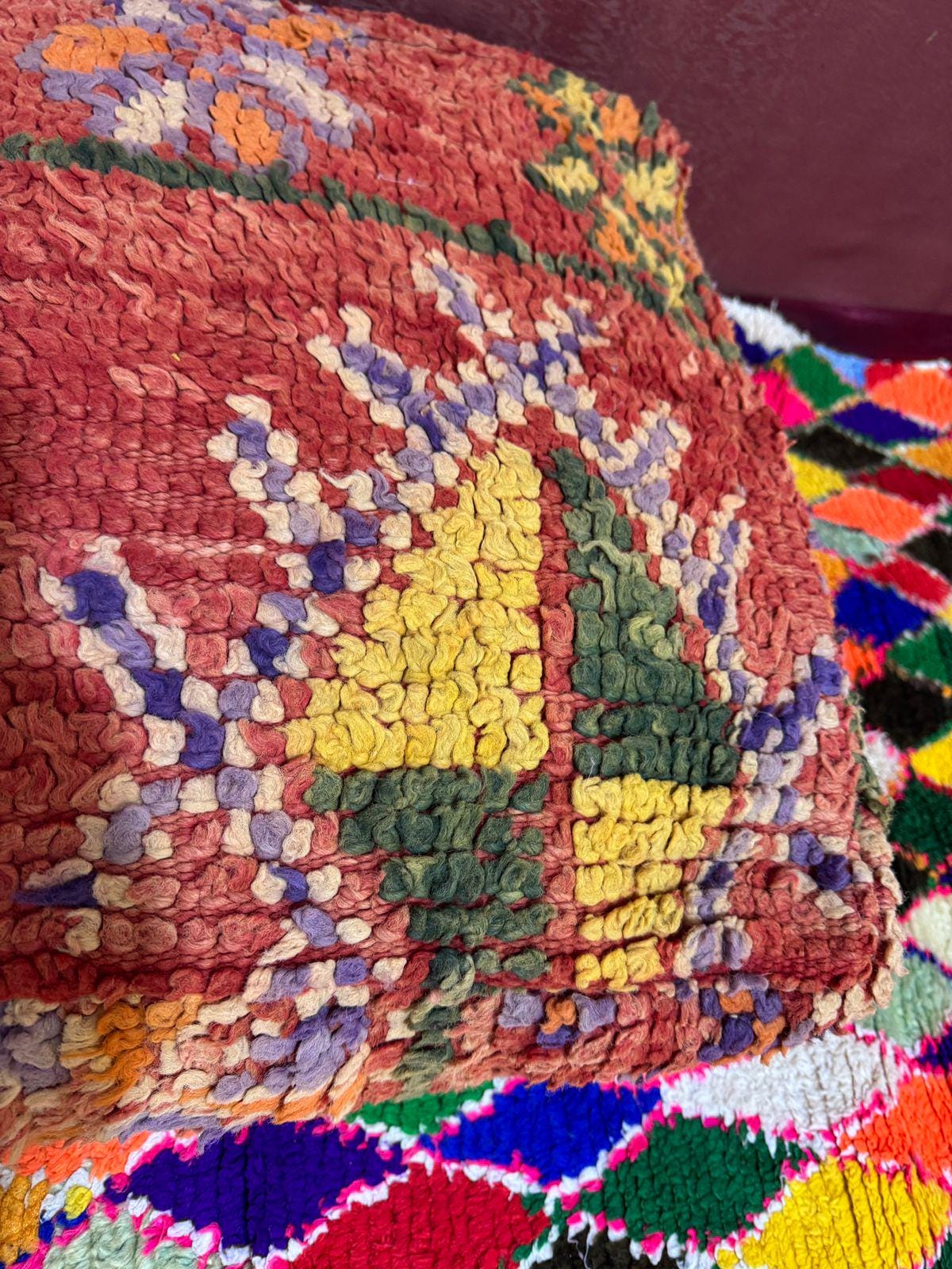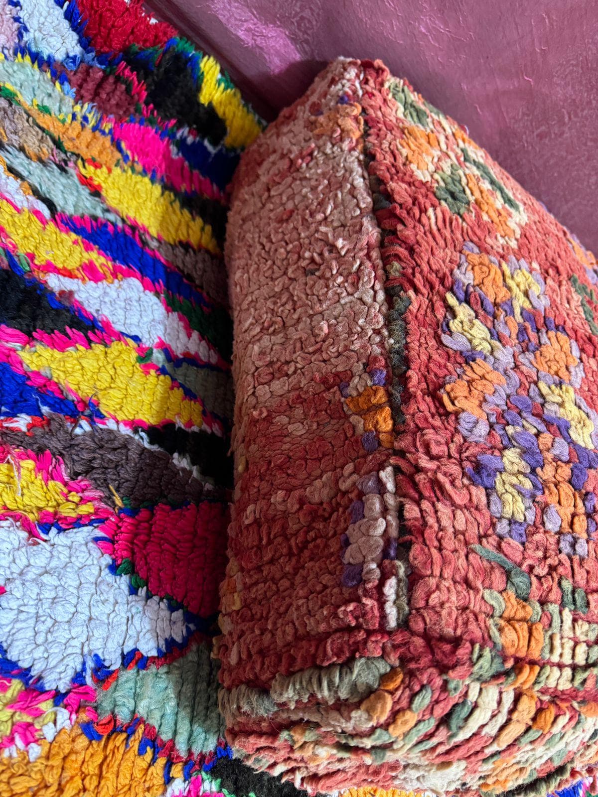 The Atlas rug is known for its Berber symbols and natural wool, featuring bold colors and free-flowing designs. The Ben Guerir rug is simple and elegant, while the Rabat rug is more classic and refined, often featuring geometric and floral designs.