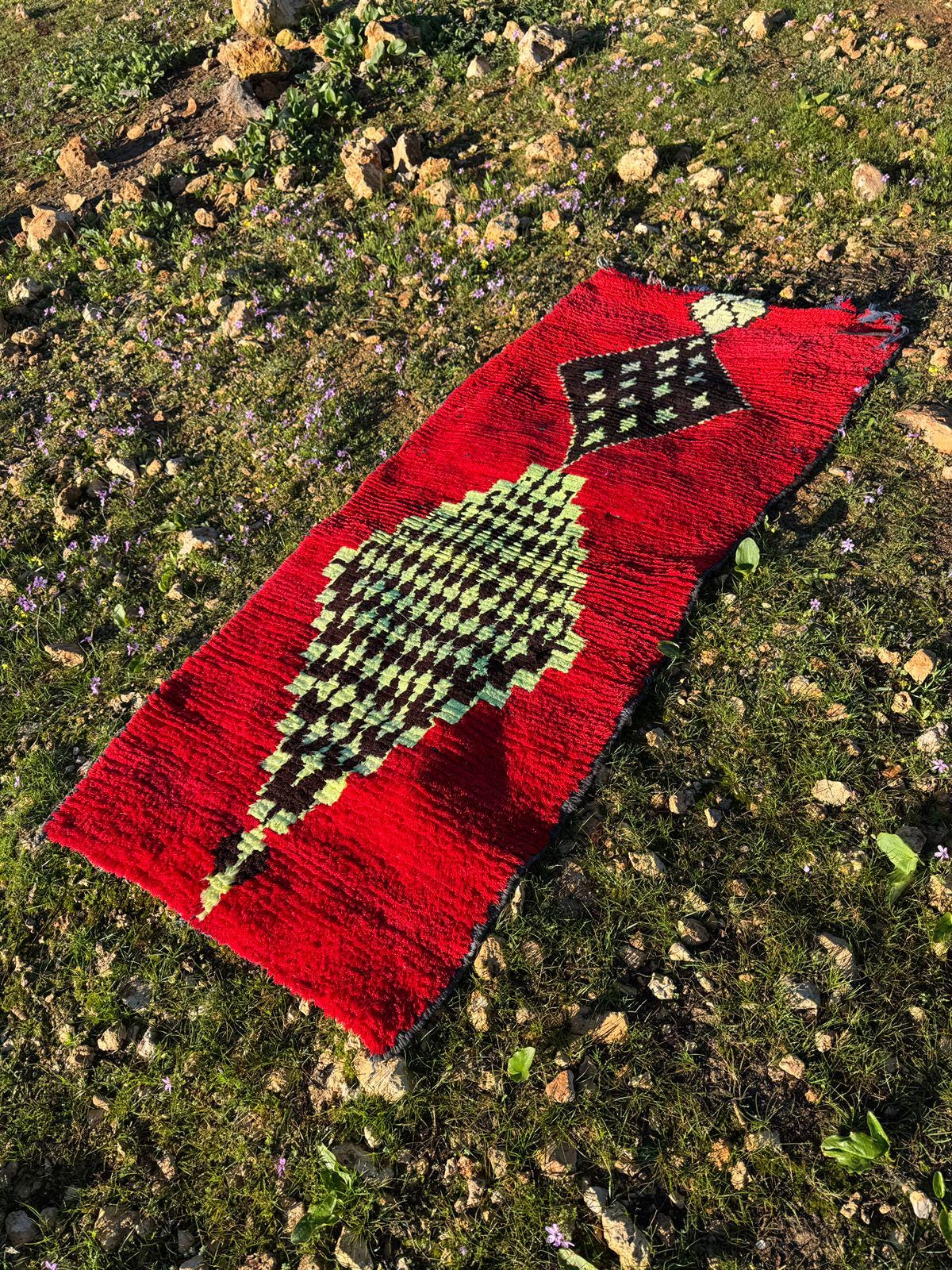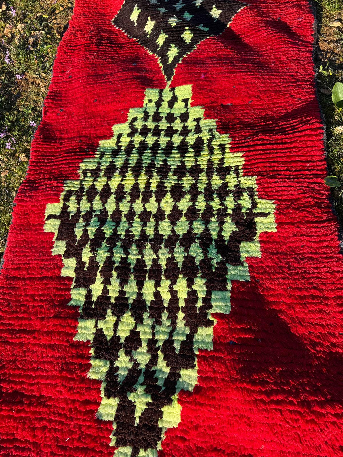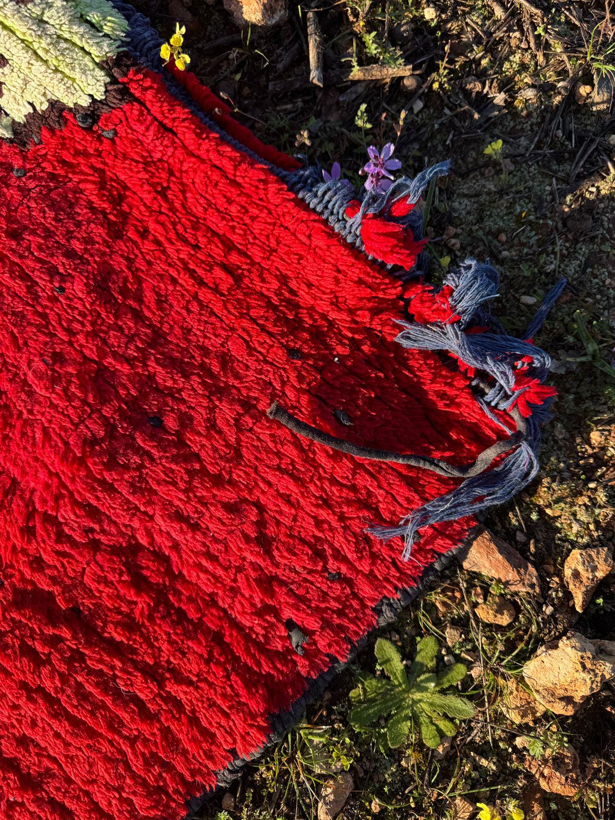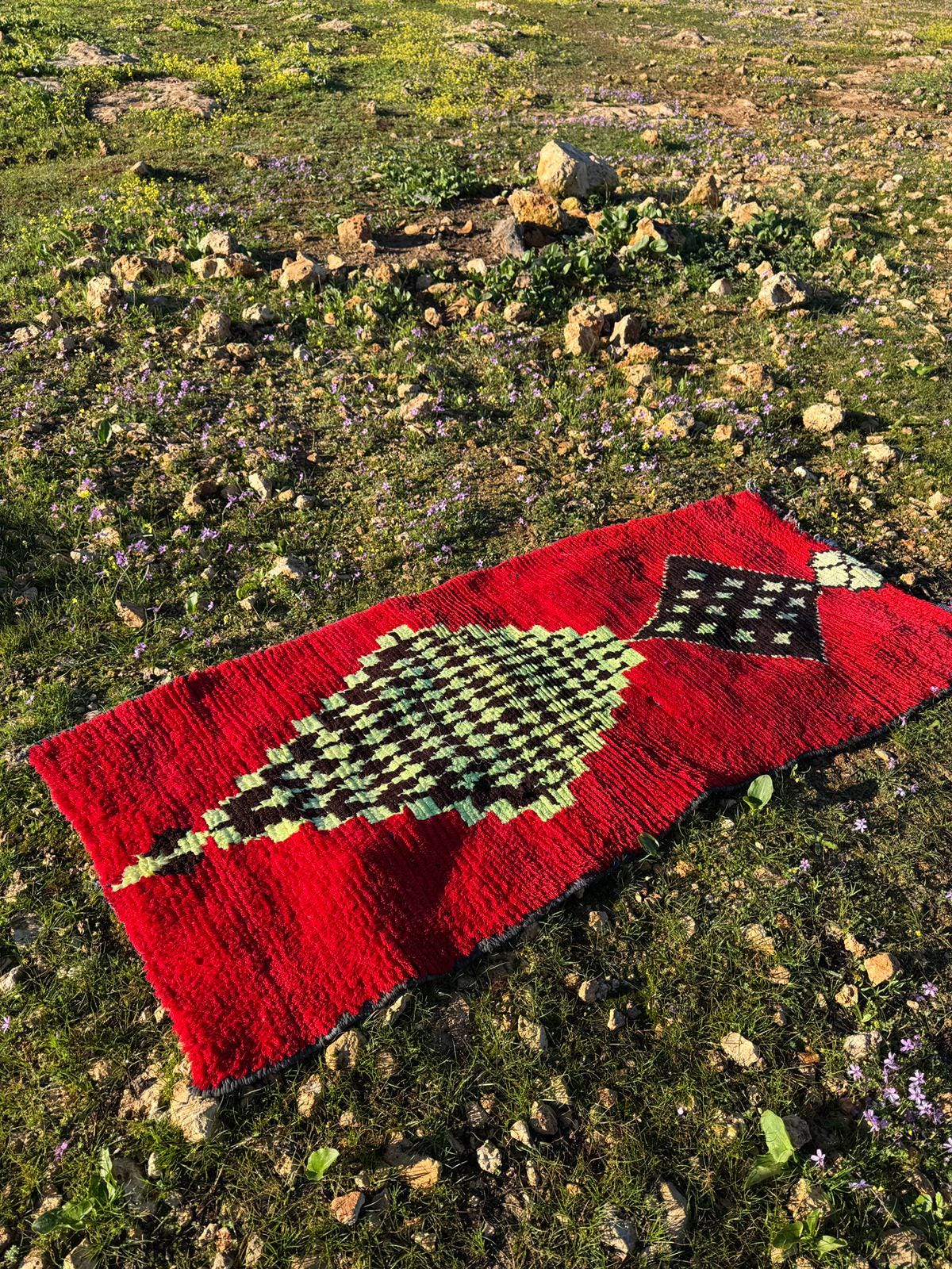 Every detail in this rug reflects authenticity — from the organic texture of the wool to the spontaneous tribal motifs that make each piece truly one of a kind. The playful yet mysterious cat figure turns the rug into a statement artwork, perfect for collectors of vintage textiles and lovers of bohemian interiors.