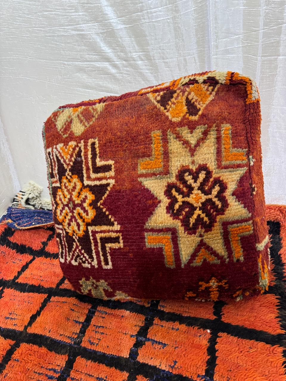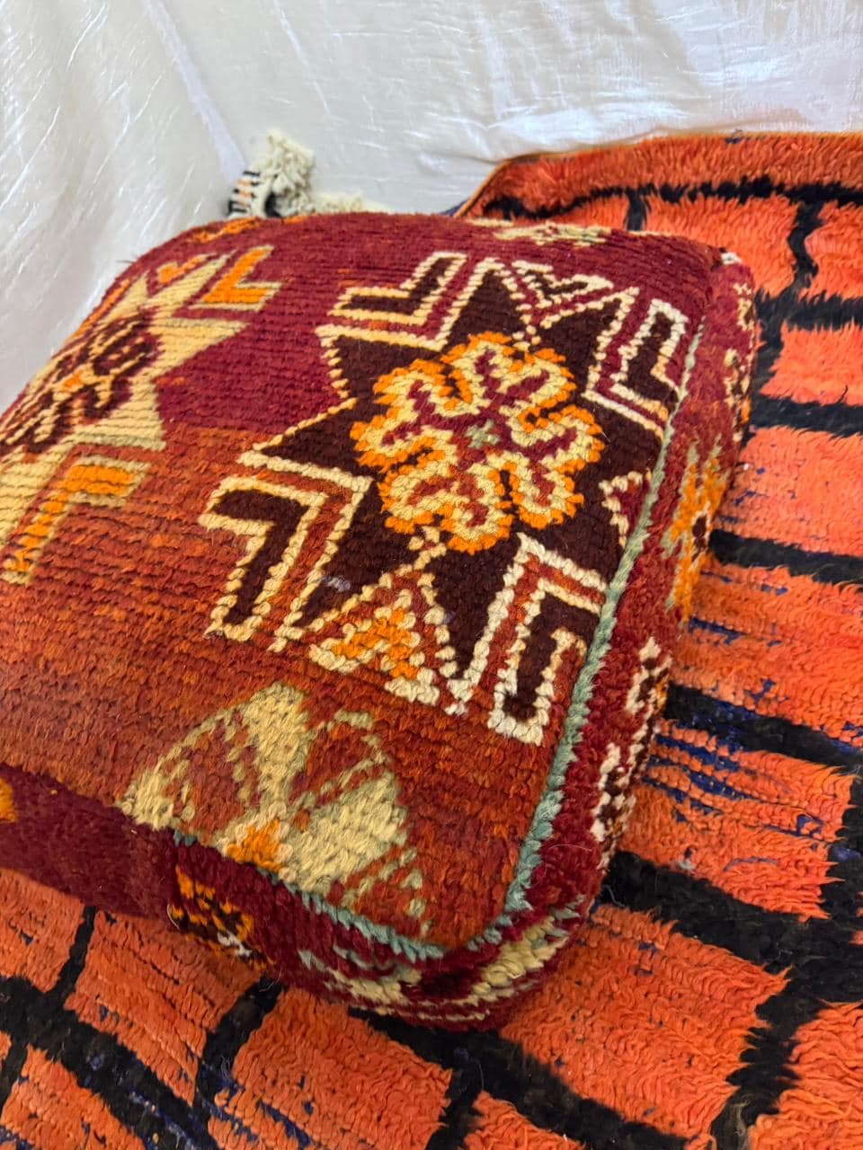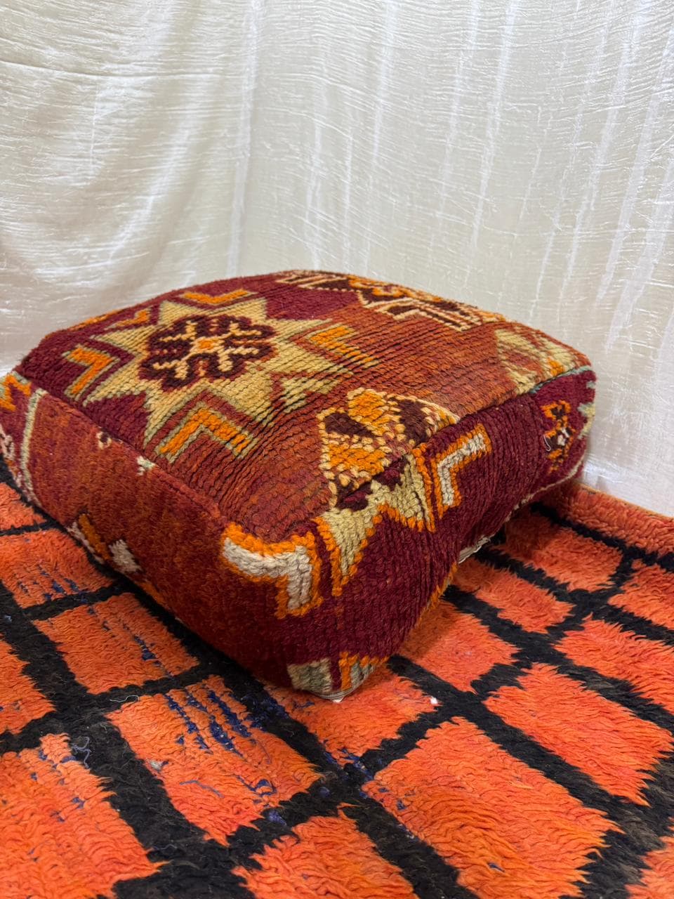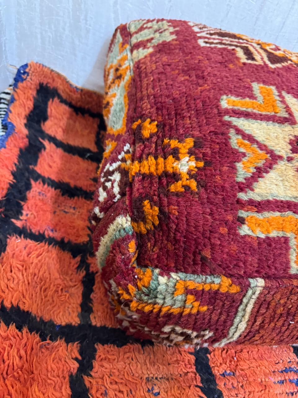 Vintage Moroccan Floor Pouf ;Handwoven Berber Cushion from Boujad Rug ;Boho Tribal Ottoman"